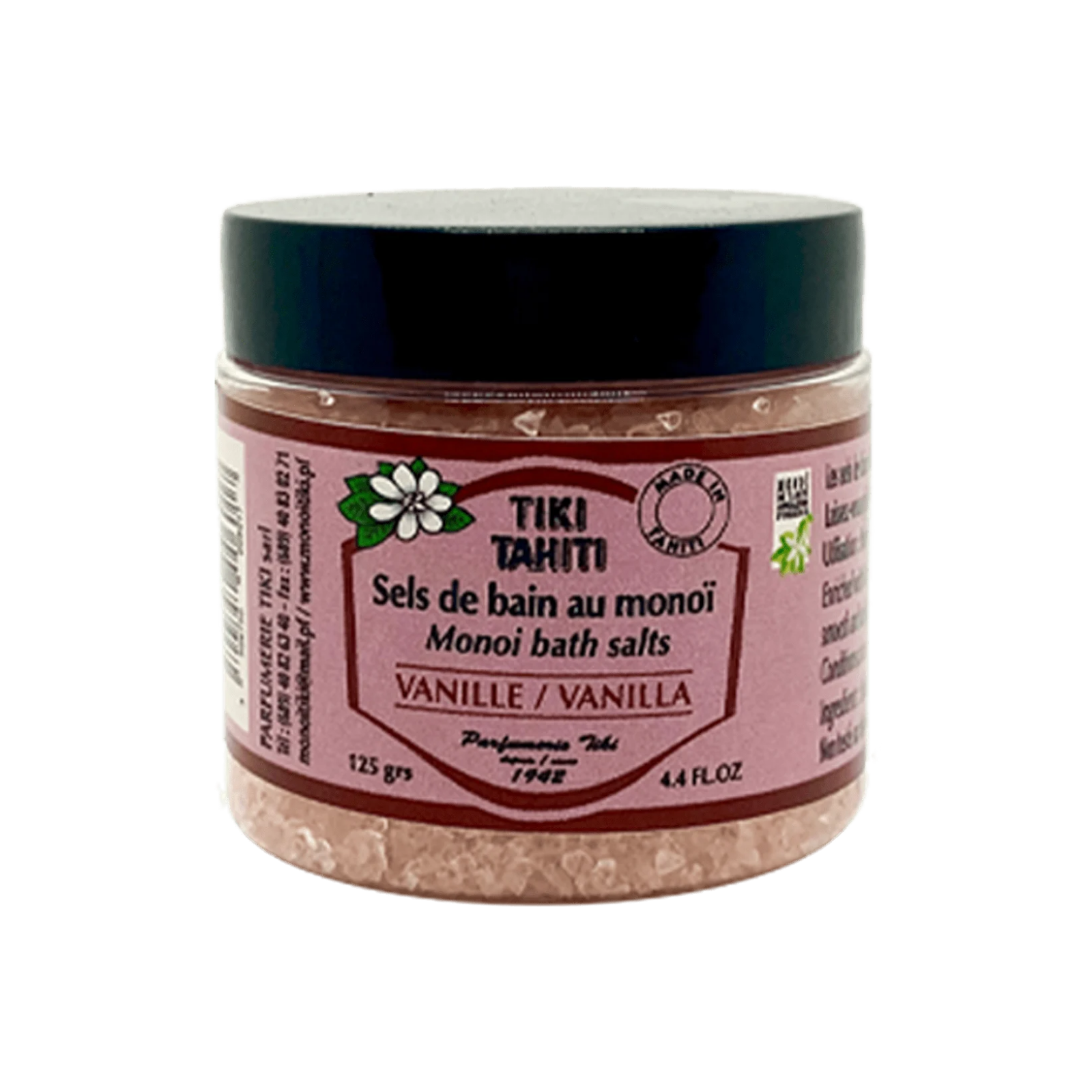 0,5 % Monoï de Tahiti cu Apelațiune de Origine (A.O.). Formulă fără parabeni, îmbogățită cu vitamina E naturală. Recipient din plastic PET de calitate cosmetică, pentru o stabilitate mai bună. INCI: Sodium chloride, Cocos nucifera (ulei de cocos), Gardenia Taitensis Flower Extract, Parfum (Fragrance), Tocopherol (Vitamina E), CI45430.